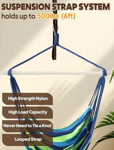 - Langlebigkeit und Sicherheit.Die robuste Konstruktion und die verstärkten Nähte gewährleisten eine lange Lebensdauer der Stühle, die bis zu 227 kg tragen können.Sie können sich darauf verlassen, dass diese Stühle Ihr Gewicht tragen und eine sichere und zuverlässige Sitzlösung bieten.Das hochwertige Baumwollmischgewebe ist außerdem verschleißfest und sorgt dafür, dass Ihr Hängesessel auch bei häufigem Gebrauch in hervorragendem Zustand bleibt.