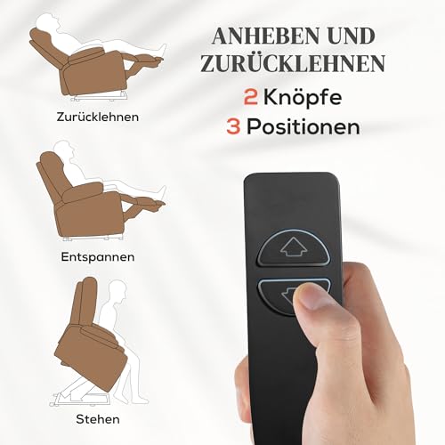 - Heben und Neigen: Dieser TV-Sessel ermöglicht eine 20°-Anhebung, ideal zum Aufstehen ohne zusätzliche Belastung für Rücken oder Knie. Er lässt sich sanft bis zu 135° neigen oder in jedem gewünschten Winkel anhalten. Die Einstellung erfolgt einfach und mühelos über die elektrische Steuerung.