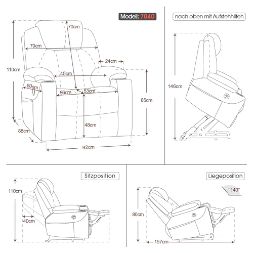 • Aufstehhilfe & Liegefunktion:Mit 1 effizienten Motor kann der Relaxsessel sehr sanft zum Aufstehen angehoben werden; zudem lässt sich die Rückenlehne des Fernsehsessels stufenlos bis zu 140° neigen