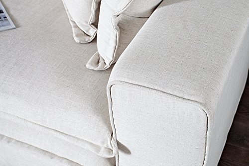 Abmessungen (ca.)Breite: 230 cm Höhe: 90 cm mit Kissen, 70 cm ohne Kissen Tiefe: 140 cm Sitzbreite: 190 cm Sitzhöhe: 50 cm Sitztiefe: 120 cm Höhe Rückenlehne: 70 cm Liegefläche 185 x 115 cm Höhe Armlehne: Maße je Armlehne: B/H/T 20 x 70 x 130 cm3x große Kissen: B/H/T 67 x 50 x 16 cm 6x mittlere Kissen: B/H/T 56 x 44 x 16 cm 2x Rückenkissen: B/H/T 100 x 52 x 20 cm 4x Sitzkissen: B/H/T 120 x 14 x 95 cm Farbe: creme Material: Leinen Polyester Produktdetails: inklusive Rücken- & Zierkissen