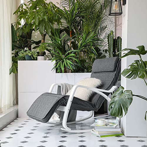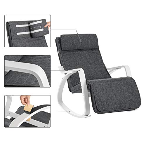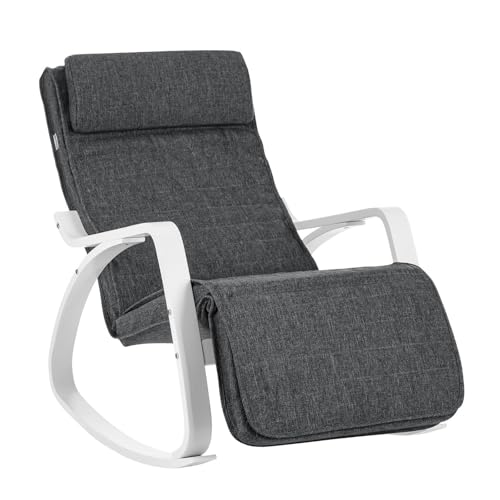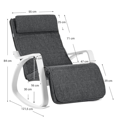 SONGMICS Schaukelstuhl, mit Armlehnen aus Birkenholz, Schaukelsessel, 5-Fach verstellbare Fußstütze, bis 150 kg belastbar, für Schlafzimmer, Wohnzimmer, dunkelgrau-weiß LYY011G01