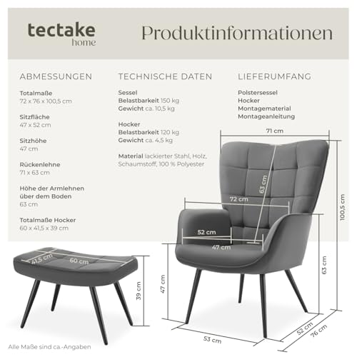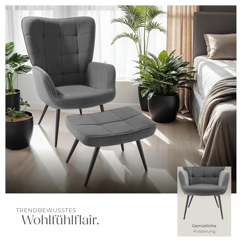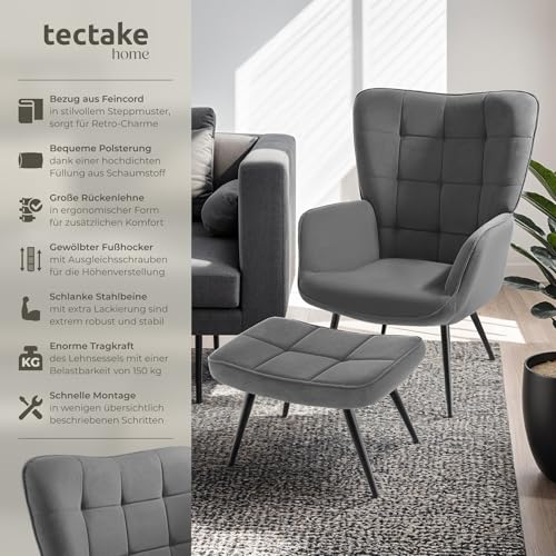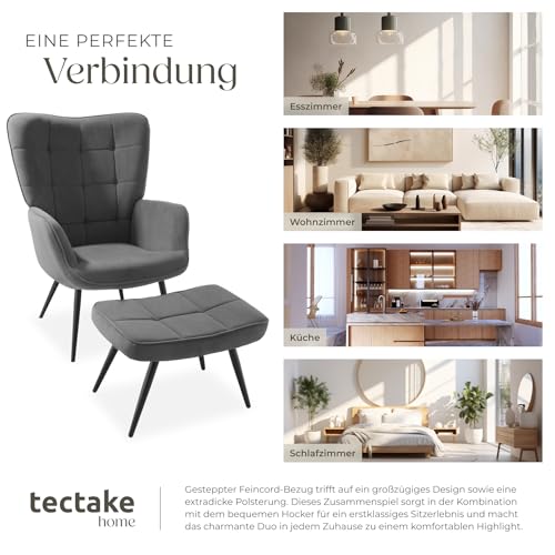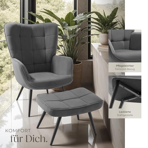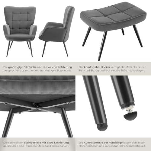 tectake® Skandinavischer Stil Ohrensessel, Sessel Hygge mit Hocker, Sessel Wohnzimmer, Schlafzimmer, Esszimmerstuhl, Statement Loungesessel, belastbar bis 150 kg – Feincord anthrazit/schwarz