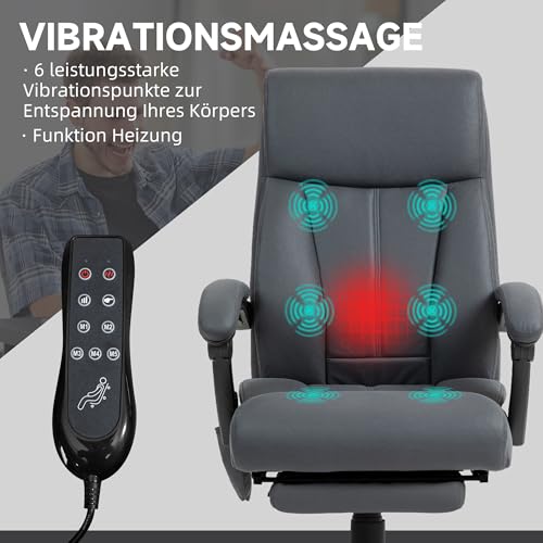 Vinsetto Bürostuhl mit Massagefunktion, Ergonomisch Schreibtischstuhl mit Liegefunktion, Lendenheizung, Höhenverstellbar Computerstuhl mit Fußstütze, Drehfunktion, Dunkelgrau