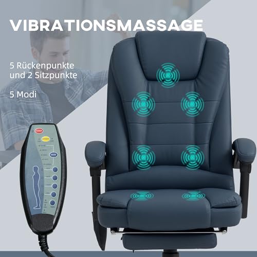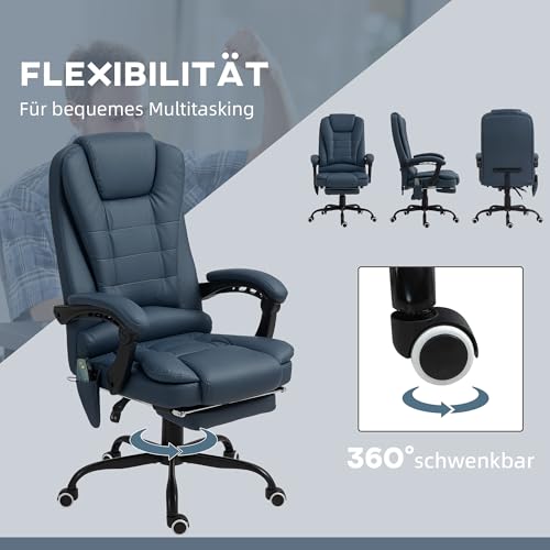 Vinsetto Bürostuhl mit Massagefunktion, ergonomischer Chefsessel mit Liegefunktion, höhenverstellbar drehbar Schreibtischstuhl mit Fernbedienung, Seitentasche, Kunstleder, Blau